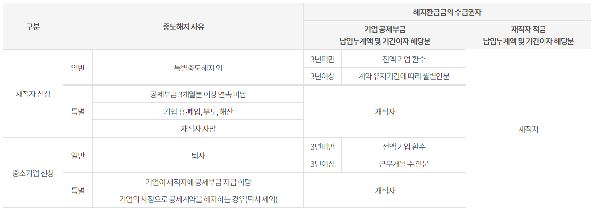 재직자 또는 기업이 신청 시 중도해지 할 수 있으며 이직 또는 퇴직 시에도 납입 누계액 및 기간 내 이자는 전액 수령 가능합니다.